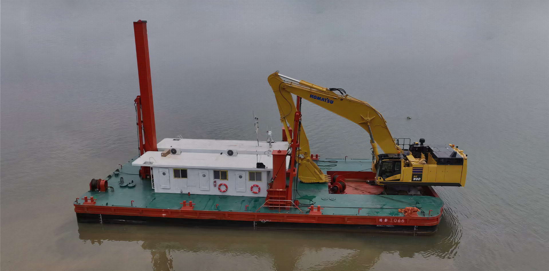 2、施工平臺(tái)穩(wěn)性強(qiáng),方便挖掘機(jī)在深水區(qū)施工作業(yè)。并且,平臺(tái)自帶航行動(dòng)力,便于水上調(diào)遣。